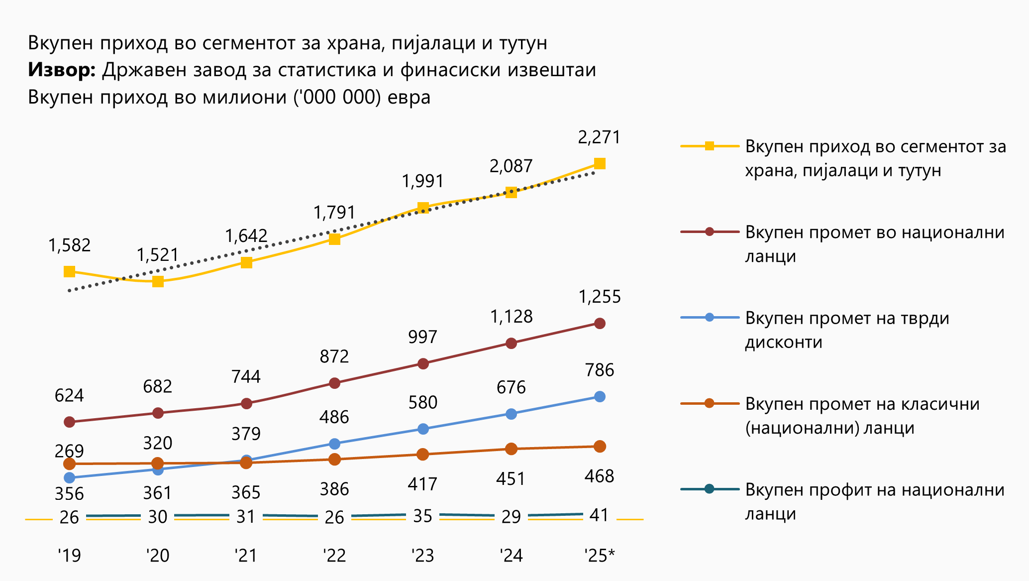 Вкупниот промет во сегментот на храна, пијалаци и тутун за 2024-та година изнесувал 2,08 милијарди евра што претставува приближно 5% раст во споредба со претходната година. За тековната се очекува да изнесува до 2.28 милијарди евра или раст од приближно 180 милиони евра (или 9%). Дел од тој раст ќе биде предизвикан од инфлацијата, која е очекувана да изнесува помеѓу 3.00% – 3.20% во 2025-та но и приспособување на маркетите на пазарните околности што ќе придонесе за постабилен раст. Од интерес е информацијата дека растот на целиот сегмент во 2024/23 е 5%, но во исто време инфлацијата изнесува 3.50% што посочува дека реалниот раст е значително низок.