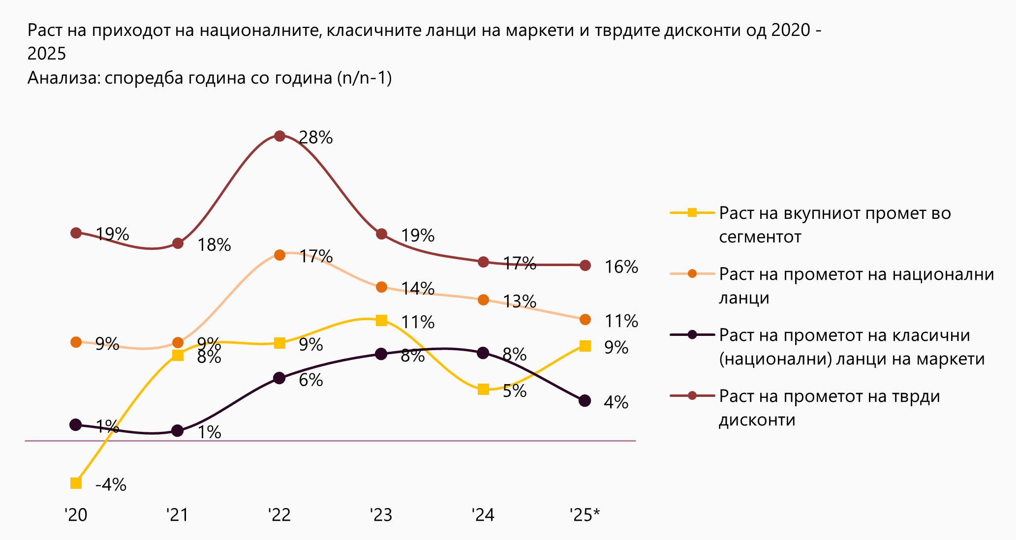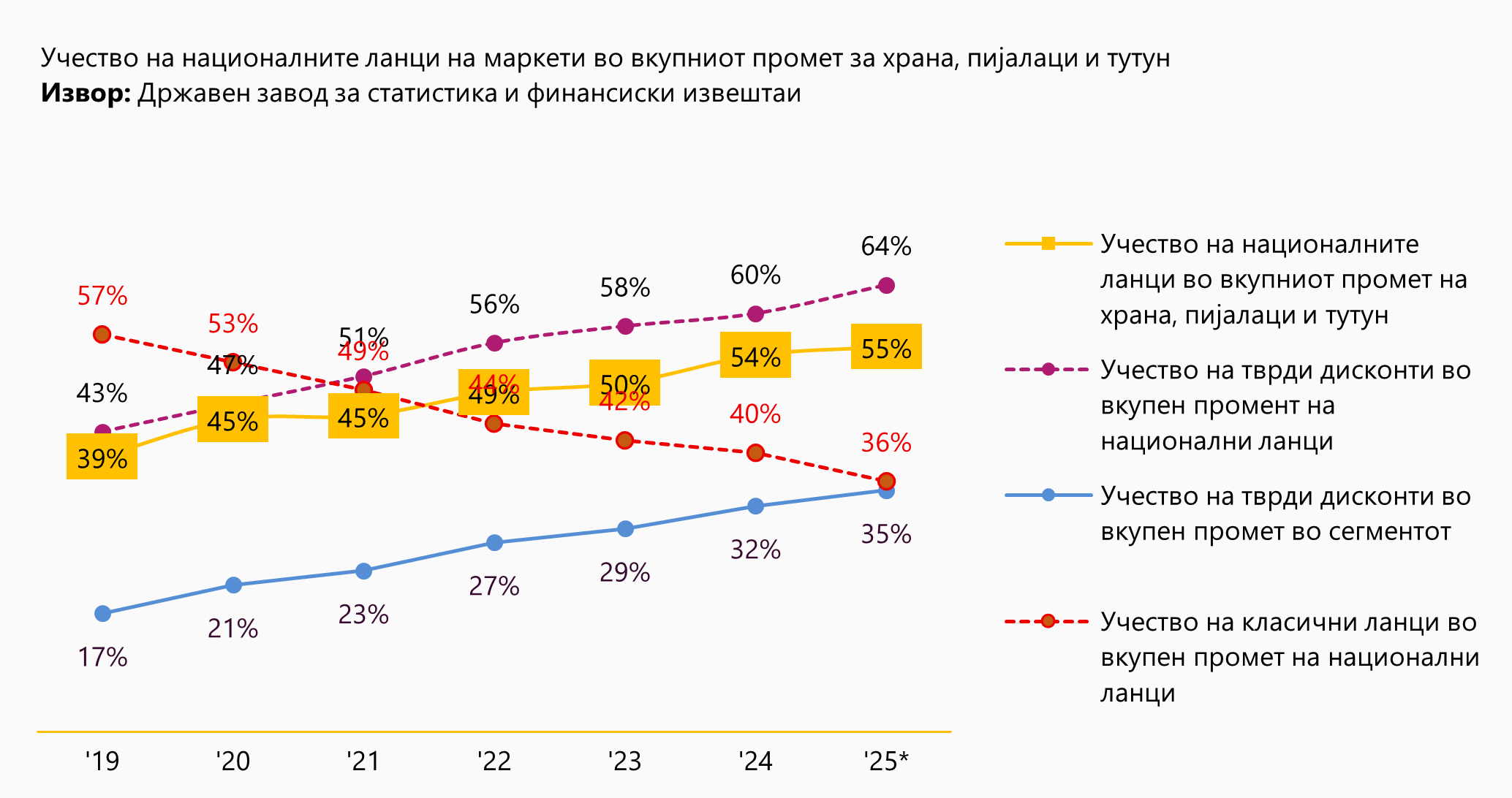 Забележливо е дека националните ланци, особено тврдите дисконти, растат со значително повисока стапка во споредба со генералниот раст. Во последната 2024-та година за која има достапни податоци, целиот сектор храна, пијалаци и тутун е 5%, споредбено со 17% на тврдите дисконти и 8% кај класичните ланци. Двоцифрениот раст на прометот на националните ланци е предизвикан, пред се, од растот на тврдите дисконти. Сеуште постои простор за преземање на дополнителни потрошувачи од ТТ и локалните ланци, што ќе овозможи растот на тврдите дисконти да биде висок (над 10%) и во следните неколку години.