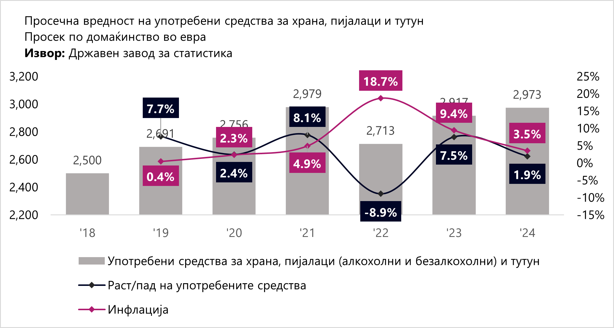 Од аспект на апсолутни вредности, домаќинствата помеѓу 2018 до 2024-та година (во просек) употребиле помеѓу 2,500 и 2,973 евра годишно за храна, пијалаци и тутун. Забележливо е дека од 2021-ва година до 2024-та постои стагнација на буџетот кој домаќинствата го употребиле за таа намена. Во исто време, со исклучок на 2021-ва и 2022-ра година, растот на приватната потрошувачка по домаќинство е или изедначена со инфлацијата или пониска од истата. Најголем, реален раст на потрошувачката од анализираните години има во 2019-та година, кога истиот изнесува 7.7%, наспроти 0.4% инфлација. Следствено, потрошувачите во просек трошеле иста вредност на пари од аспект на вкупен буџет. Во 2022-ра, каде е забележана највисоката инфлација, имаат и намалување на употребените средства за -8.9% или 2,713 евра. Тоа што може да се заклучи е дека потрошувачите употребуваат еднаков буџет низ годините, но имајќи во предвид растот на платите во периодот 2024/2025, може да се очекува дека во апсолутен износ во 2025/2026 вкупниот буџет да го надмине прагот од 3,000 евра.